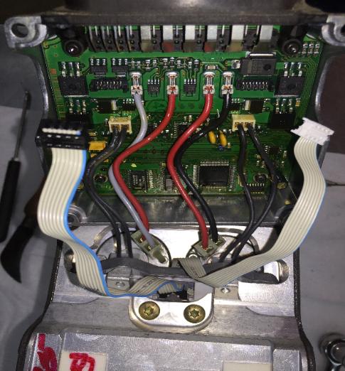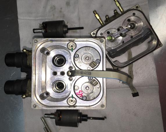 As the next section comes apart it releases the back of the motors. The ribbons run to pressure sensing pads in both ends of the unit. It's pretty clear from the accumulation of crud which is the rear circuit. |